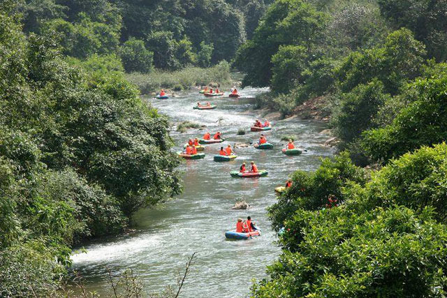 到了漂流處,同事們各自穿好救生衣,戴好頭盔,和各自的搭檔一起坐進小皮艇。工作人員使勁一推,小皮艇就沖進了河里,剛一下去,戰斗還沒開始,全身就已經是濕漉漉的。