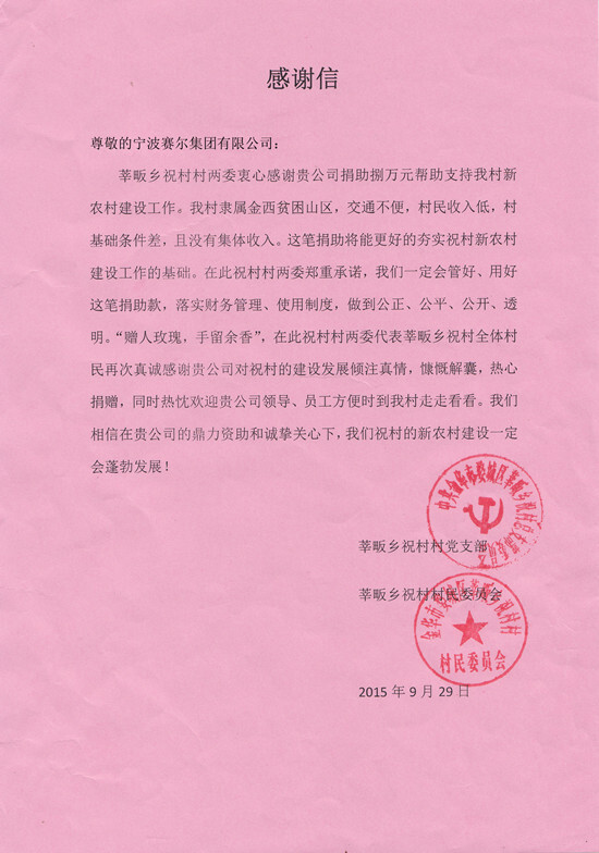 目前,以清潔環境為主題的“山野清風”項目、關愛失獨家庭老人為主題的“賽爾親風”項目、支持農村建設為主題的“賽爾愛農”項目和確定捐資支持寧波海上絲綢之路研究院建設的“賽爾絲路”教育基金項目構成了我集團回饋社會、奉獻愛心的公益慈善事業新體系,集團將每年撥出專項資金,專注運作好這些公益慈善項目,踐行綠色企業使命。