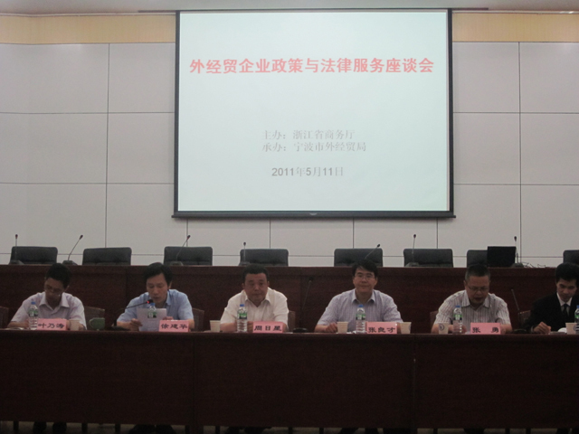 5月11日下午,省商務(wù)廳周日星副廳長帶領(lǐng)政策與法律服務(wù)團(tuán)來我市召開了外經(jīng)貿(mào)企業(yè)政策與法律服務(wù)座談會。省商務(wù)廳周日星副廳長、寧波市委組織部張良才副部長、省商務(wù)廳公平貿(mào)易局張勇局長等領(lǐng)導(dǎo)出席會議,會議由市外經(jīng)貿(mào)局徐建華副局長主持。中基寧波集團(tuán)、中化寧波公司、億泰控股集團(tuán)、貝發(fā)集團(tuán)等30余家企業(yè)參加了本次座談會。