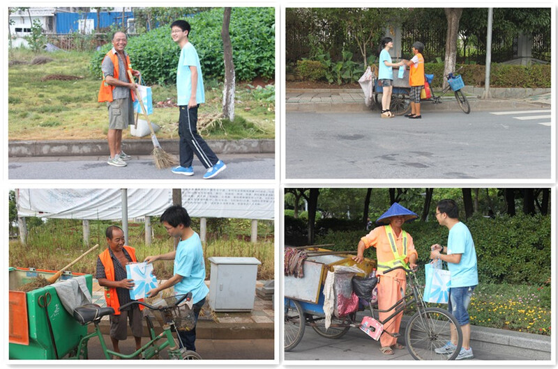環(huán)衛(wèi)工人們接過物品,露出了憨厚的笑容,激動地拉著志愿者們的手連連說謝謝。此次活動歷時三個多小時,共送出了80份物品。