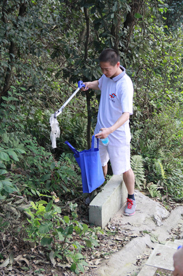 從靈山村入口走進步道,便是遠離塵囂的山野。放眼處,盡是令人心醉的柔美,清風徐徐,野花搖曳;拾階而上,沿途遠望,綠毯如茵,夾雜著高高低低的樹叢,點綴著不同色彩的小花。大家一邊觀賞優美風光,一邊撿拾步道及邊上的塑料袋、塑料飯盒、礦泉瓶、可樂罐等難以降解的生活垃圾。沿途中,過往游人紛紛豎起大拇指,甚至有人要加入隊伍。其中,有一支隊伍是寧波大學爬山隊,帶隊的大學后勤集團夏處長表示,回去要發動學生積極參加這種公益活動。
