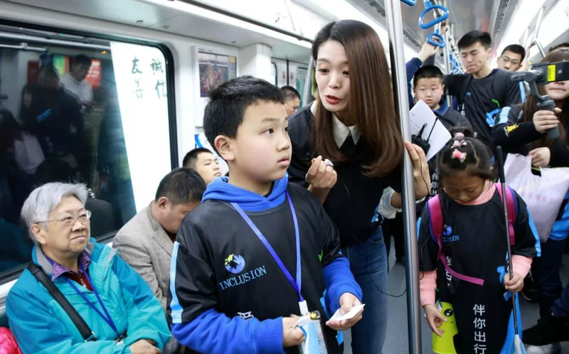 上午9點(diǎn),賽爾志愿者在澤民地鐵站與星寶家庭匯合,在直播主持人帶領(lǐng)下,向群眾宣傳自閉癥和無障礙出行的相關(guān)知識,并協(xié)助星寶乘上地鐵,幫助他們順利抵達(dá)四明中學(xué)運(yùn)動場。