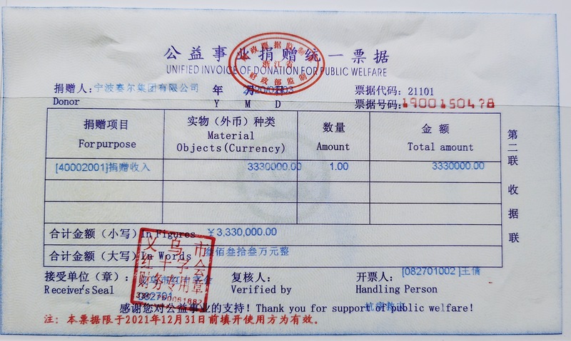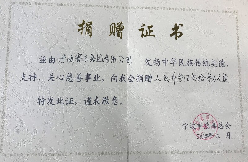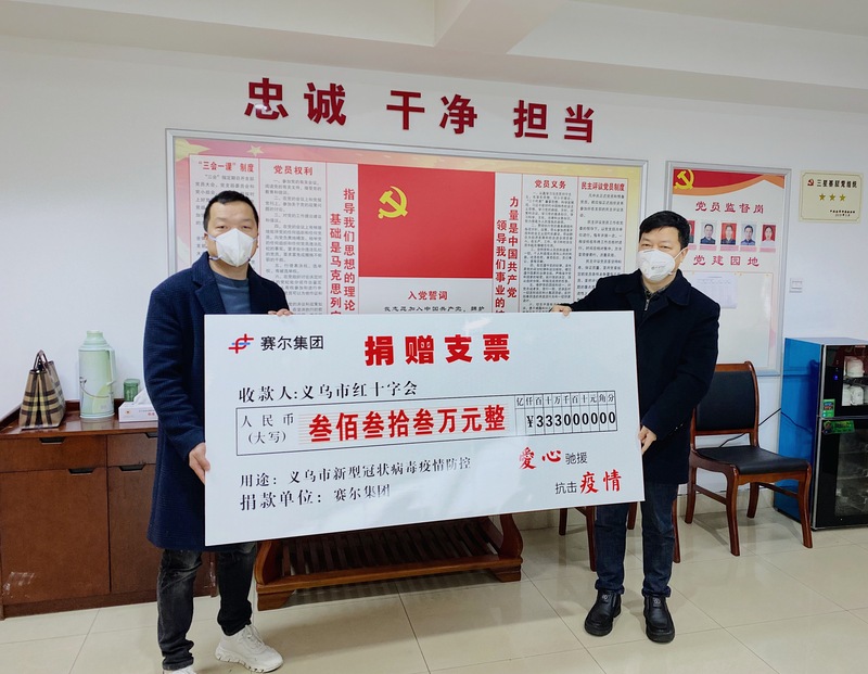 2月3日,賽爾集團派代表分赴寧波市、義烏市兩地政府指定的接受捐贈主體單位——寧波市慈善總會和義烏市紅十字會,將666萬元善款(兩地各333萬元)一次性捐贈到位,全力支持抗擊新冠病毒肺炎疫情。