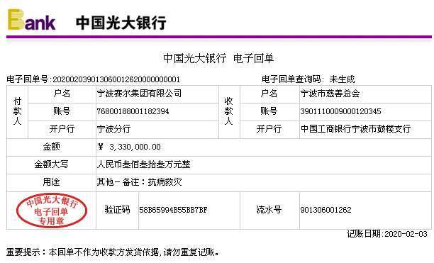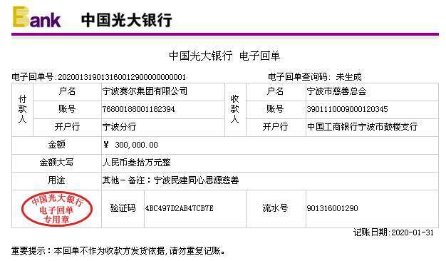 此前,集團董事長徐平炬先生也通過寧波民建市委會同心慈善基金捐贈30萬元用于抗擊新冠疫情。