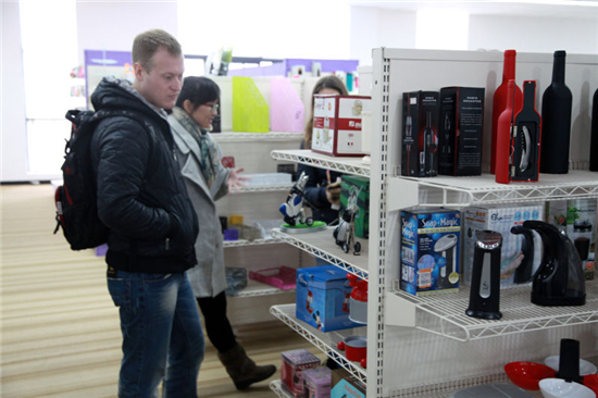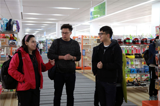 留學生一行先來到我集團產品展示中心,當看到和大型超市一模一樣的產品展示中心時,他們感到非常驚訝,當了解到中心展示著近10萬種出貨產品時,更是贊嘆不已。他們不時拿起感興趣的產品細看,并向工作人員詢問產品細節,有些還向工作人員索要樣本冊表示回去研究。