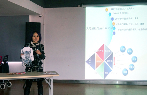 金華龍飛工藝品公司專業生產銷售珠寶柜、相框、鏡框等工藝產品。會上,總經理李文慧重點介紹了新產品多功能珠寶柜,外觀可以照鏡子,里面則可以掛首飾、毛巾、毛衣鏈等各種飾品配件,新穎獨特,設計性和實用性兼具,獲得在場業務人員的一致青睞。
