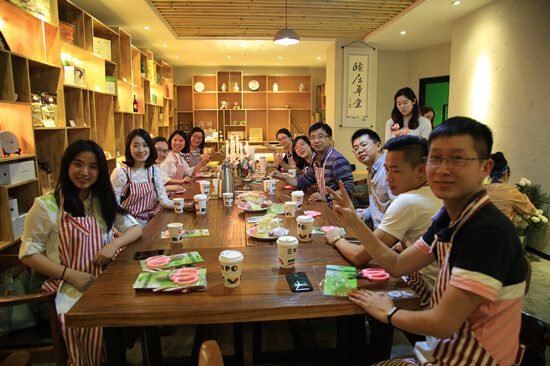 下午2點(diǎn),寧波的講師們來(lái)到了一家咖啡廳,咖啡廳的走廊里,就看到了一塊我們公司專(zhuān)屬插花課畫(huà)報(bào),畫(huà)報(bào)一旁,簇?fù)碇魇狡贩N的花,淡淡的花香撲面而來(lái),沁人心脾,美麗的心情溢于言表。走進(jìn)咖啡店,花藝師早已為大家準(zhǔn)備好了插花素材:布,剪刀,絲帶等,整整齊齊地放在桌面上。講師們陸續(xù)到齊,帶上圍裙,點(diǎn)上蠟燭,一邊聽(tīng)年輕美貌的花藝師講解花的品類(lèi),一邊跟著剪枝修葉,動(dòng)起手來(lái)。花朵妖嬈盛放,講師們聽(tīng)著音樂(lè),品味下午茶,打點(diǎn)著自己的DIY花束,是一種享受,更是一種藝術(shù)的熏陶。有趣的是,插花活動(dòng)里驚現(xiàn)4名男講師,他們可有自己一門(mén)小心思呢,等著包好花回家給老婆(女友)大人獻(xiàn)殷勤!