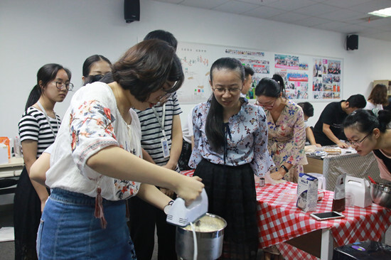 兩位講師首先為大家簡單地介紹了制作木糠杯的流程,演示的同時也分享了做木糠杯的小技巧,比如餅干屑是越細口感約好,奶油不能發(fā)得太硬……小伙伴們紛紛表示get了很多新知識。講師安排小組成員分工協(xié)作,一個打奶油,一個碎餅干,一個擠奶油,經(jīng)過一個多小時的細心制作,大家的木糠杯都逐漸成型啦,雖然長相不一,但口感都是獨一無二,看上去就很好吃!