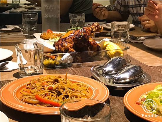 這次聚餐我們選在了義烏田畈西式簡餐,感受了網(wǎng)紅美食的魅力。提前預(yù)定的田畈秘汁烤全雞果然沒讓我們一行人失望,肉質(zhì)鮮嫩,手撕過癮,多吃不膩,但貌似廚師大神今天用力過猛抖了太多鹽,不過口感還是極佳的。黑椒牛柳意面、芝士蓋飯、香酥鱈魚、焗大蝦、凱撒沙拉、鮮嫩牛排還有美味的披薩都很驚艷。好在這次留了胃給飯后甜點堅果布朗尼,濃郁的巧克力加上脆口的堅果,層次分明口感特別棒,飯后嘗一塊真是享受。