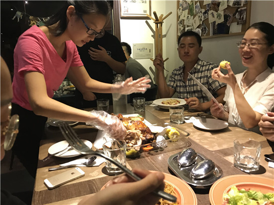 吃著笑著談著,積攢一天的疲憊感漸漸消失了,大家談?wù)劰ぷ髁牧纳睿灰鄻泛酢S煨焱盹L與絲絲細雨,揉著吃撐的小肚子,明天又是充滿干勁的一天!