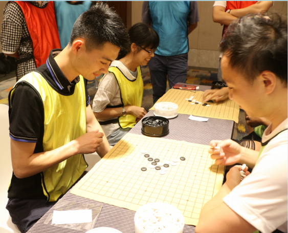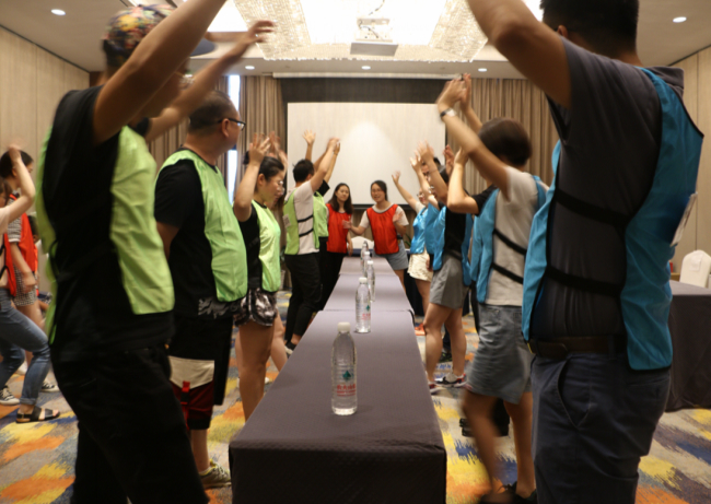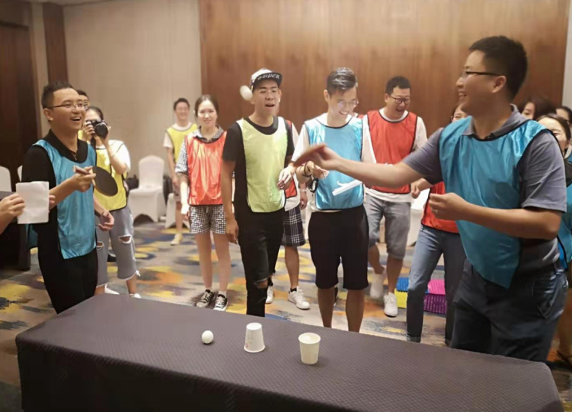 下午則是一場腦力和體力的對抗賽——名牌大戰。名牌大戰之前共要進行3個游戲環節,獲勝隊伍可以贏得第四環節的復活權。第一個游戲是趣味接力賽,共有飲料大戰、夾豆、指壓板跳繩和乒乓球接力四個項目,總用時最少的一隊勝出。此環節尖叫聲此起彼伏,每組都拼勁全力爭分奪秒。第二個游戲是搭紙牌,全隊人員各有分工,充分展示了團隊協作力。接下去的棋牌大作戰中,每組每個人都可以成為攻擂方和守擂方,調動了每一位成員的積極性。