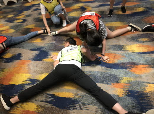 最終我們迎來了名牌大戰,每組6人分為2組三三對戰車輪對抗指壓板單腳互推項目。原本綠隊和藍隊之前獲得很大的優勢,沒想到激烈對決后紅隊逆襲成為冠軍。