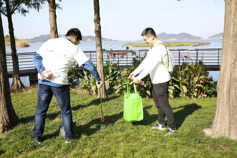 到了目的地,大家迅速分好組后開始繞東錢湖緩緩而行,在環保的同時我們有說有笑,也使得原本陌生的同事之間互相熟悉起來。水杯、塑料袋等垃圾在美麗的東錢湖草坪上顯得十分突兀,同事們兩人一組,拿著垃圾袋和夾子,一個個干得熱火朝天。雖然當天的太陽很曬,但是每個人都堅持把四周的垃圾撿得干干凈凈。