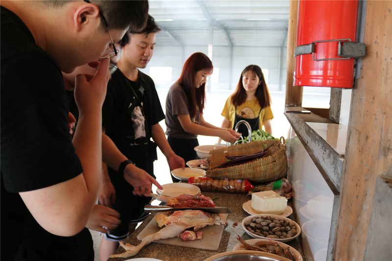 到了中午,大家分組用土灶燒火做飯。雖然難以抗拒夏日的炎熱,但大家齊心協(xié)力,各司其職,生火洗菜,做飯刷鍋,效率頗高。最后,一桌子的人間煙火就完成了。吃著大家一起做的飯,聊著天,工作的疲憊早已消散。