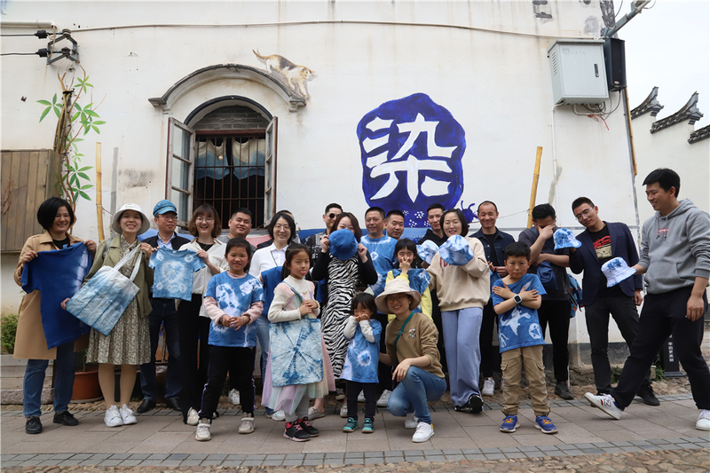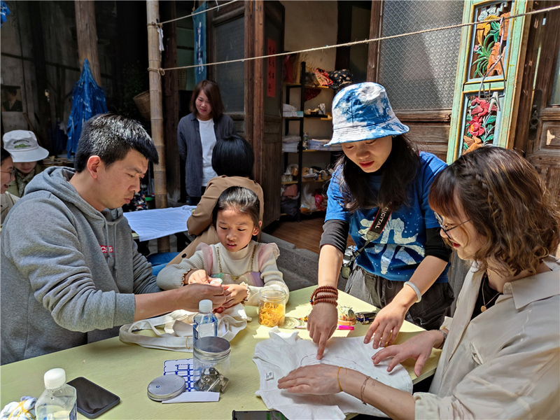 輕輕推開老底子的木頭門,映入眼簾的是一個靜謐純粹又極富藝術(shù)氣息的藍色世界,店里的每一件作品都是店主一針一線縫制、扎(蠟)染而成。在這里手作,是一種安靜的享受。專業(yè)工藝老師在講解藍染的歷史起源時,引起了大伙兒濃烈的求知興趣。選好物料后,我們跟隨老師,一步一步地捆扎、縫制、描稿、畫蠟、染布、脫蠟、漂洗,完成了一件件“藝術(shù)孤品”。