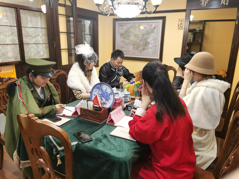 吃完晚飯,我們驅車來到一家沉浸式推理館,選了一個民國主題的劇本殺,選好角色后各自先了解劇本并換裝。不得不說,我們的“少帥”和“仙姑”換完裝后確實別有一番風味,驚艷眾人。后面又玩了“女生宿舍”主題的密室逃脫,恐怖加懸疑,NPC還時不時地出來嚇人,最后憑借團隊的高智商和工作人員的提示,順利完成劇本。