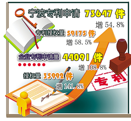 數據顯示,2012年,寧波市專利申請量為73647件,同比增長54.8%;專利授權量59175件,同比增長58.5%,其中授權發明專利2065件,同比增長27.1%;寧波因此成為15個副省級城市中唯一一個授權專利突破5萬件的城市。