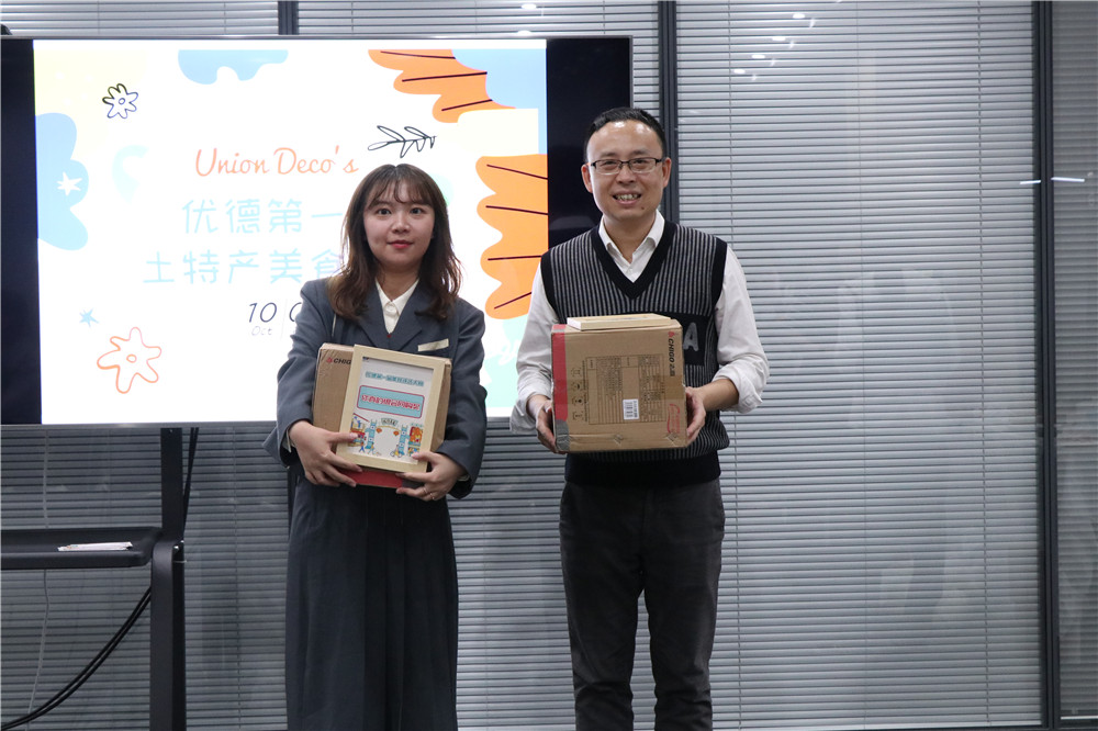 四位評(píng)委用心品嘗選手帶來(lái)的每一道美食,對(duì)選手精心制作的每味進(jìn)行點(diǎn)評(píng),最后投出自己寶貴的一票。在活動(dòng)的最后,我們?cè)u(píng)選出了“最佳土特產(chǎn)獎(jiǎng)”、“你真的很會(huì)點(diǎn)外賣獎(jiǎng)”、“最難吃土特產(chǎn)獎(jiǎng)”、“最有意義美食獎(jiǎng)”等獎(jiǎng)項(xiàng),并為獲獎(jiǎng)的選手送上精美禮品。