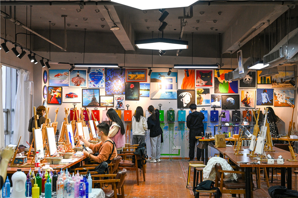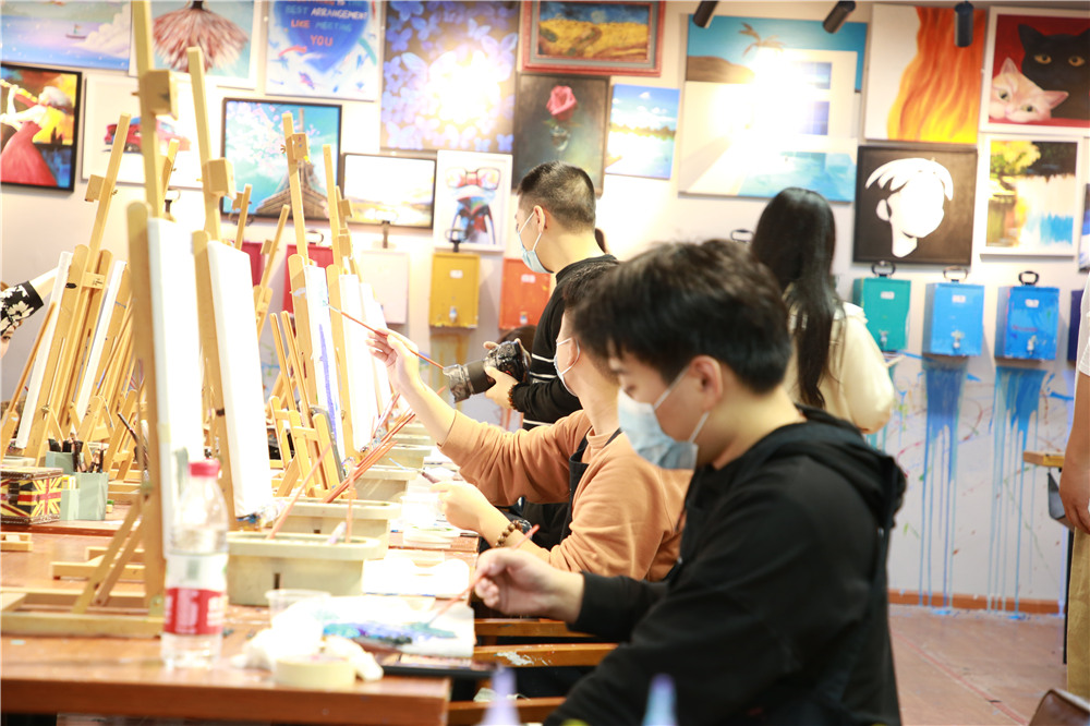 11月19日上午,迎著蒙蒙細雨,我們一行人順利抵達藝術工作室。習慣了坐在電腦面前的小伙伴們對藝術畫作充滿了好奇,迫不及待地自行選擇了肌理畫、油畫等不同風格的DIY畫作。老師先帶大家觀摩了色彩各異的成品,大家便開始搜索自己想臨摹的畫作。在沒有接觸之前,大多數人感覺手繪很簡單,但是自己動手調色之后才發現不是那么容易,里面包含了色彩搭配、透視關系、調色原理等專業知識。