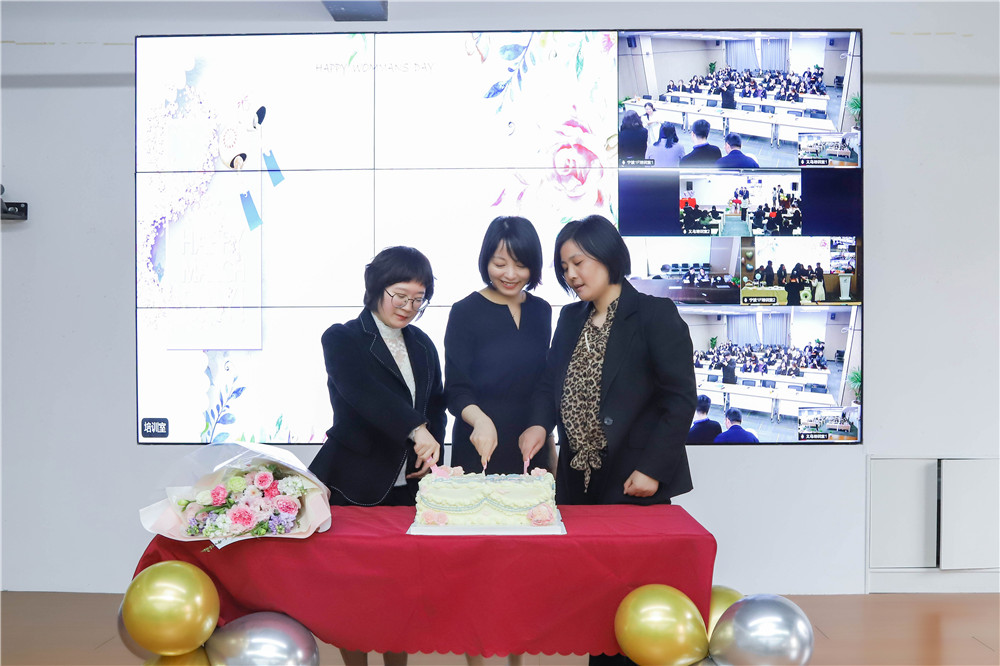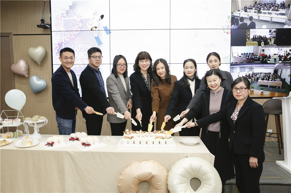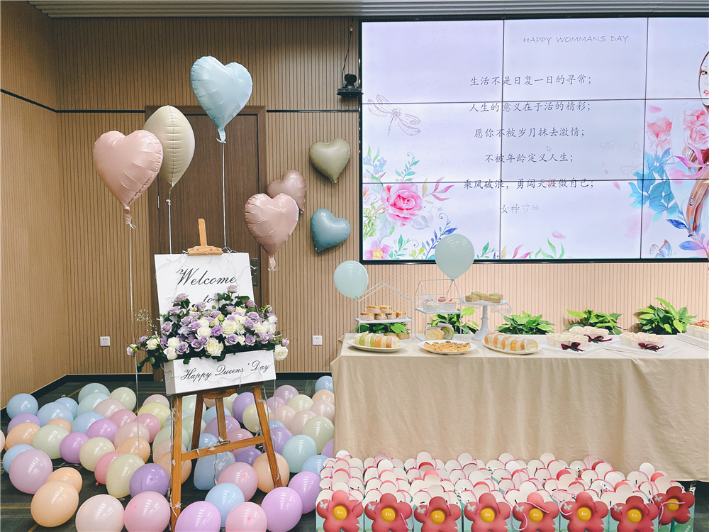 活動室里,淡雅的白紫玫瑰,搭配馬卡龍色的氣球,添上閃爍著柔光的燈串,再用幾款造型精致的蛋糕,營造出了濃郁的節日氛圍。吳穎姐和彩姐攜同其他財務負責人一起分切女神節專屬蛋糕,把活動氣氛推向了高潮。大家一邊享受著美味的蛋糕,一邊觀看同事們特意錄制的祝福視頻,輕松愉悅充盈席間。