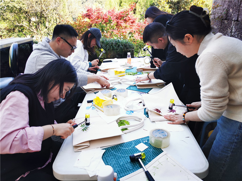 午餐后,小伙伴們有的在莊園閑逛消食賞景,有的沉迷棋局對(duì)弈,還有的在溫暖春風(fēng)里安靜午睡。小憩過(guò)后開(kāi)始下午手工活動(dòng)——植物敲染帆布包,把植物粘貼在帆布包上用錘子用力敲打出汁水,然后撕去膠帶即可。操作步驟簡(jiǎn)單卻是實(shí)實(shí)在在的體力活,大家舉著錘子叮叮當(dāng)當(dāng)沒(méi)一會(huì)兒開(kāi)始手臂發(fā)酸,但沒(méi)有一位輕言放棄,甚至為了更好地發(fā)力都站著敲打。最后大家在一片歡聲笑語(yǔ)中完成了各自的作品。