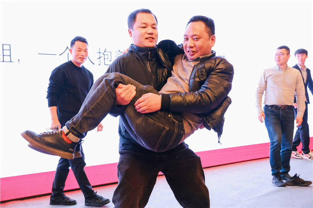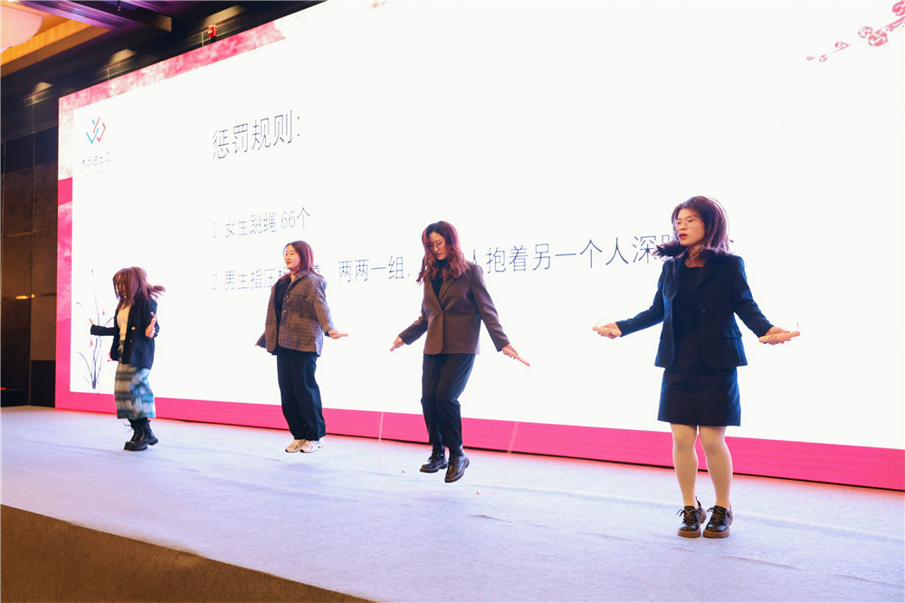 回首2023,各部門也有未完成的業(yè)績(jī)指標(biāo)。而獎(jiǎng)罰分明,方能激發(fā)干勁。會(huì)議上,我們也針對(duì)未完成業(yè)務(wù)指標(biāo)的部門領(lǐng)導(dǎo),設(shè)定了小小的懲罰。我們的懲罰分為女生部分和男生部分。女生的懲罰是跳繩66個(gè);男生的懲罰是兩兩一組,在指壓板上進(jìn)行深蹲,要求一人抱著另一個(gè)人深蹲5個(gè)。懲罰的游戲環(huán)節(jié)讓原本稍有嚴(yán)肅的會(huì)議氣氛瞬間變得輕松而歡快起來。瞧,那指壓板上顫抖的雙腿和吃力的表情包瞬間吸引了大家的眼球,讓我們猜猜是哪位領(lǐng)導(dǎo)的表情又會(huì)被部門成員做成新的表情包呢?
